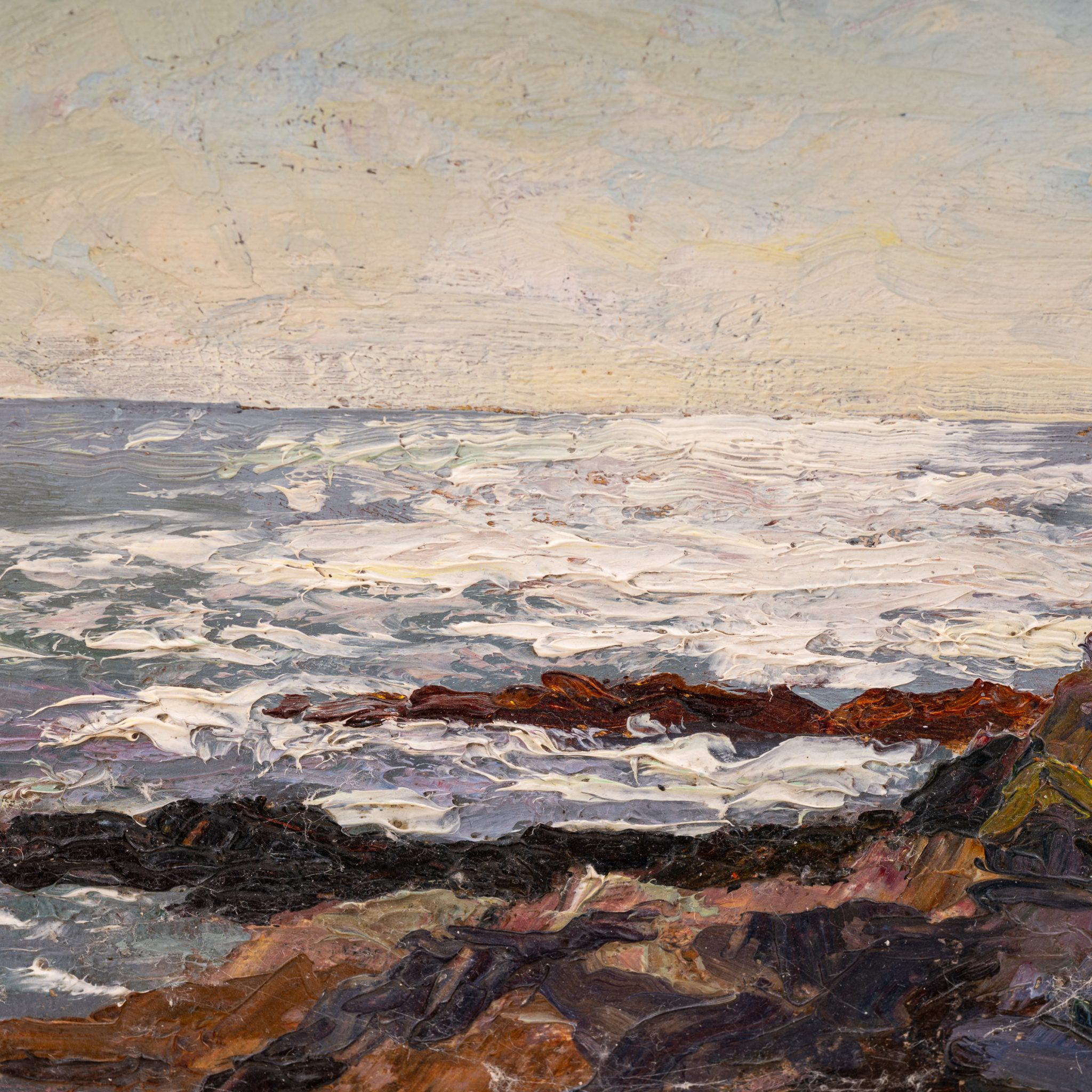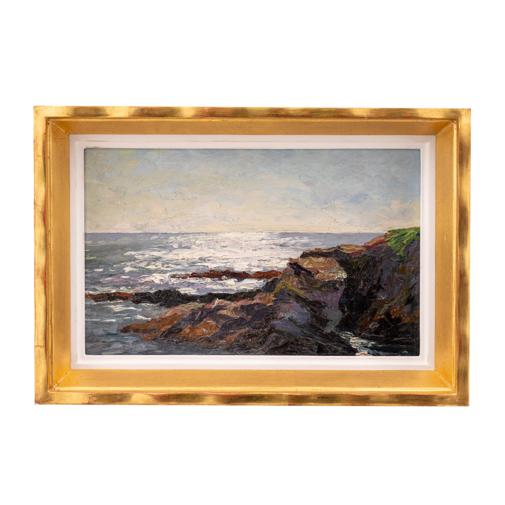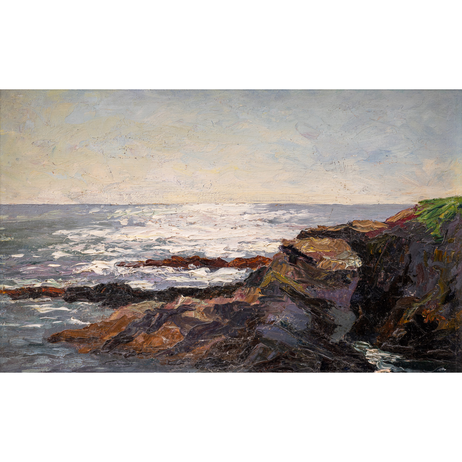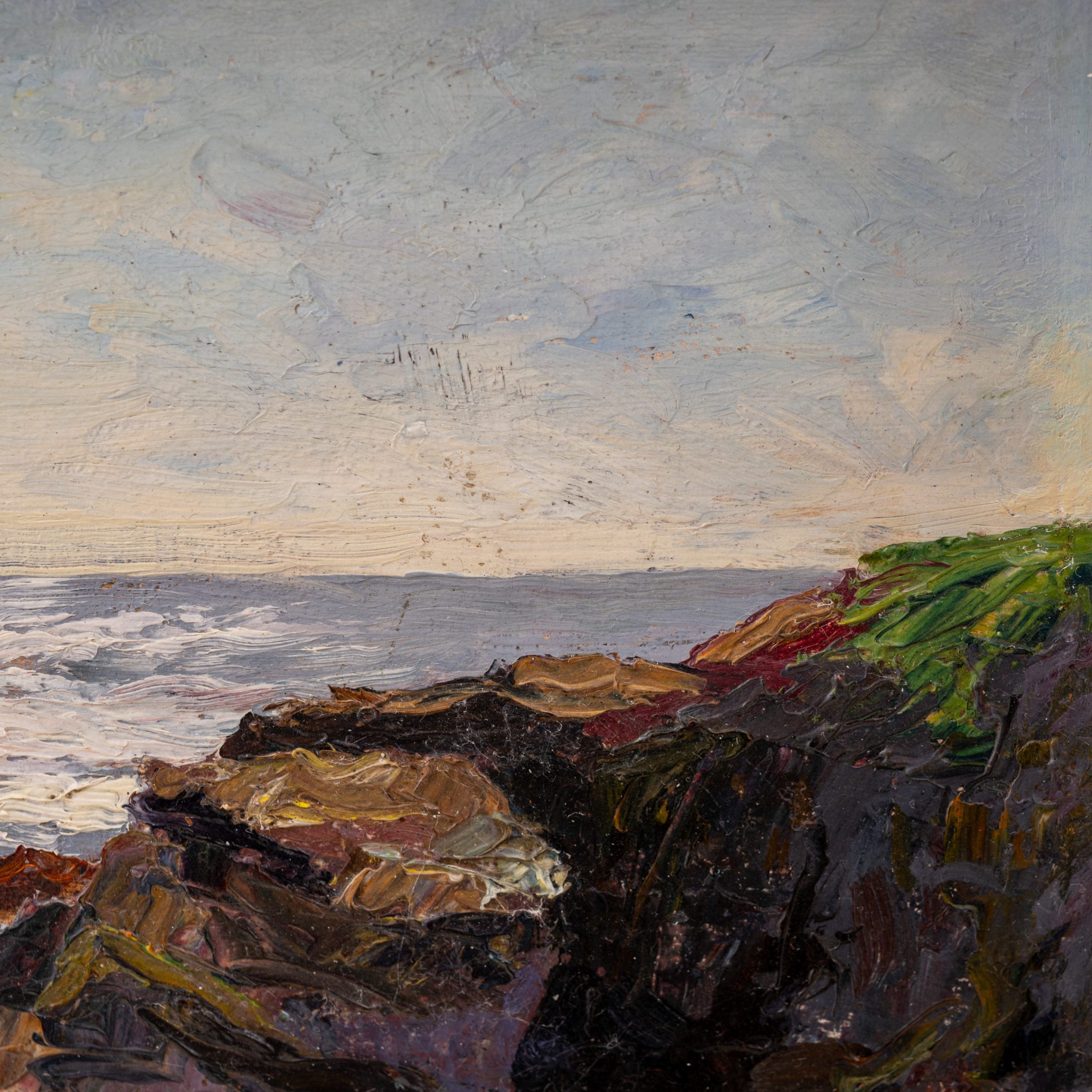 Die Ölstudie „Abendliche Felsenküste“ zeigt eindrucksvoll Littrows feinsinnige Naturbeobachtung und ihr besonderes Gespür für Lichtstimmungen. Im Zentrum des Bildes stehen die raue, felsige Küstenlinie und die sanften Spiegelungen der untergehenden Sonne auf der ruhigen Meeresoberfläche. Das Zusammenspiel von Licht und Reflexen verleiht der Szene eine stille, kontemplative Atmosphäre. Anders als in ihren dynamischen Darstellungen der Brandung dominiert hier eine ruhige, beinahe meditative Stimmung, in der die Natur in ihrem abendlichen Gleichgewicht erfasst wird.