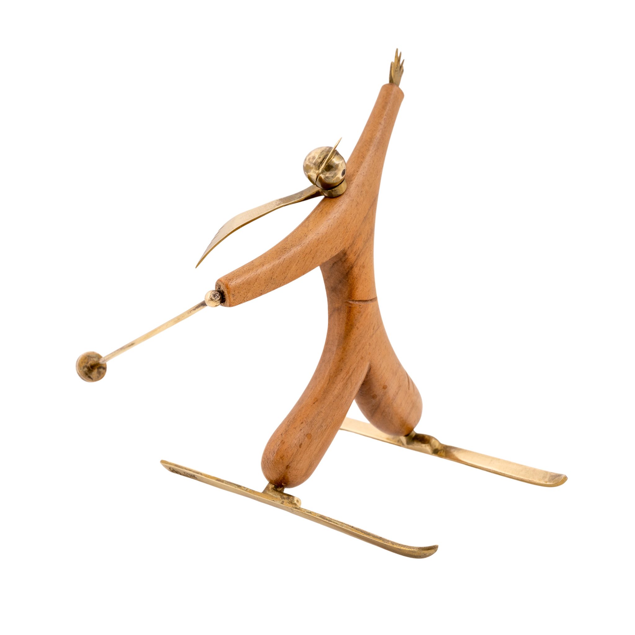 Diese stilisierte Skifahrerfigur fängt diesen Geist mit Charme und Humor ein. Der aus Holz gefertigte Körper ist auf das Wesentliche reduziert und vermittelt auf spielerische Weise die Bewegung und Dynamik einer Abfahrt, leicht unbeholfen, aber voller Schwung, unterstützt durch den flatternden Schal, der den Vorwärtsdrang zusätzlich betont. Kopf, Hände, Skier und Stöcke bestehen aus poliertem Messing und bilden einen reizvollen Kontrast zum warmen Holzton.