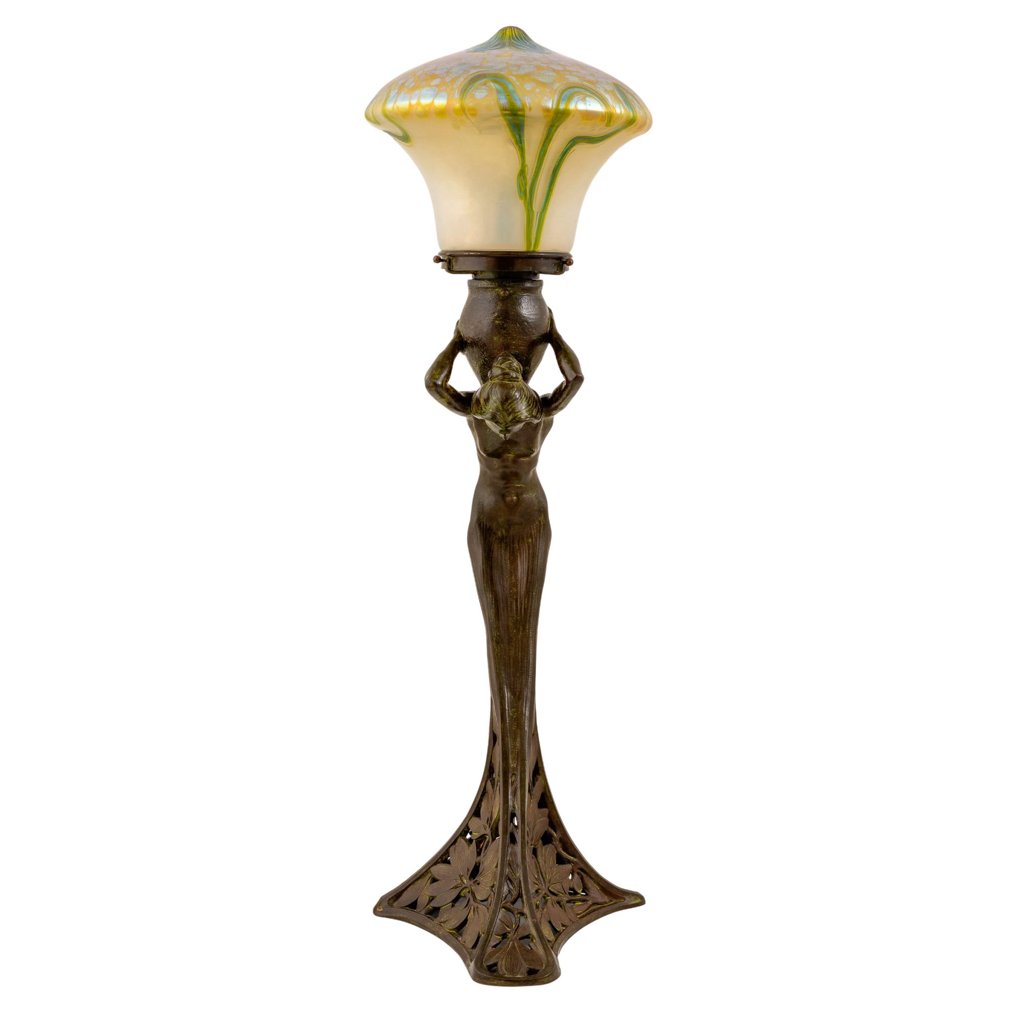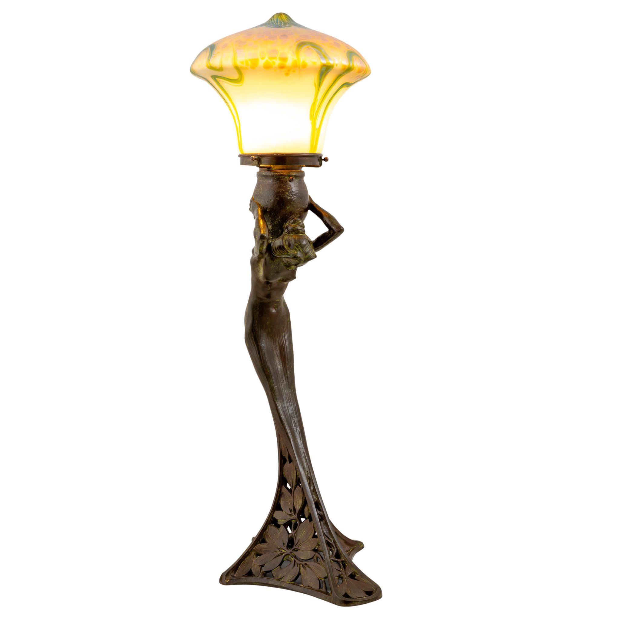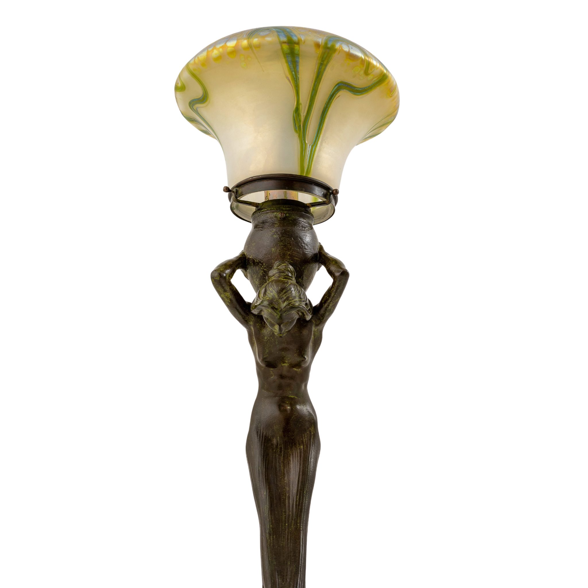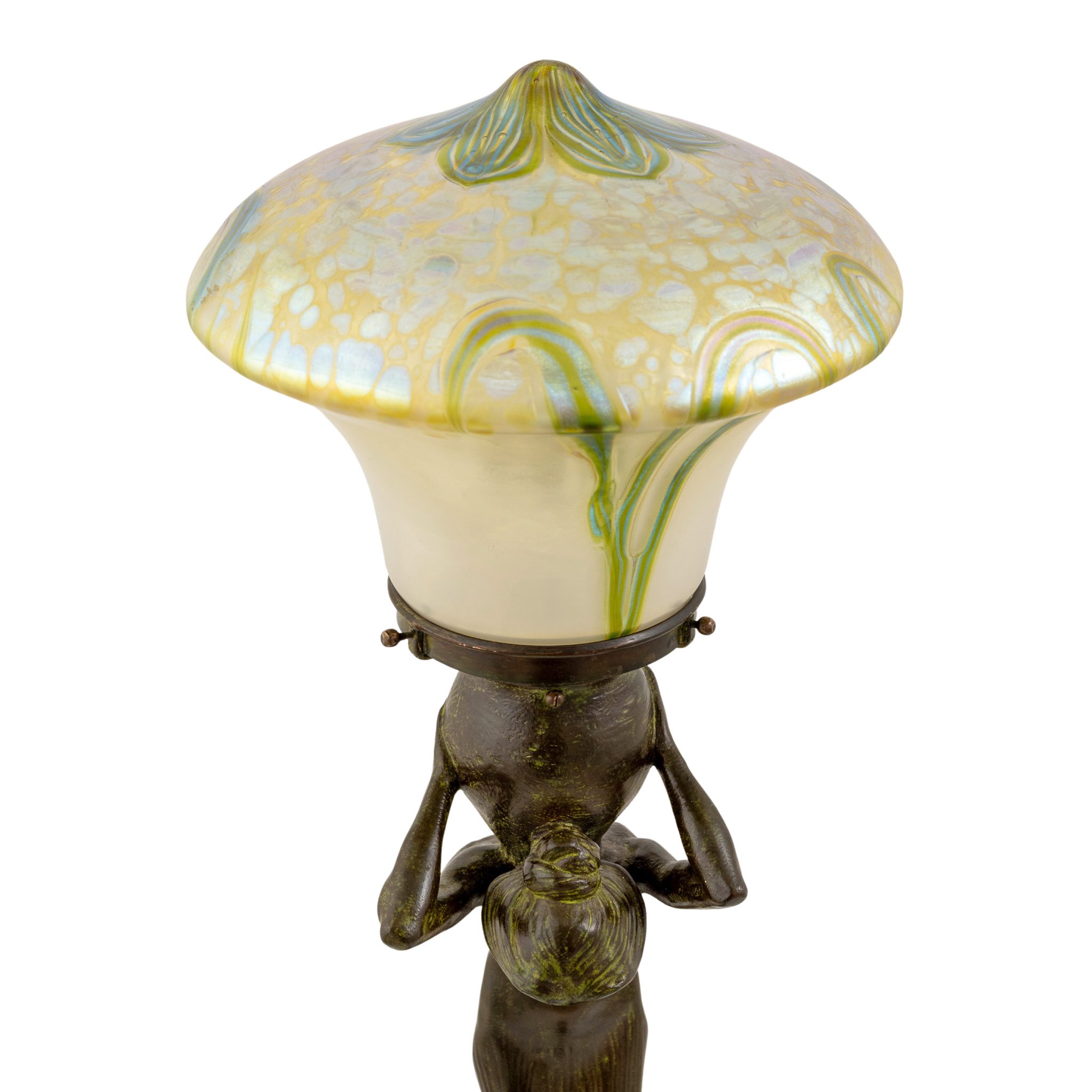 Tischlampe mit Frauenfigur und Loetz-Schirm, Gustav Gurschner, Bronze, gegossen, braun patiniert, Schirm Johann Loetz Witwe, unidentifierter Dekor, um 1901