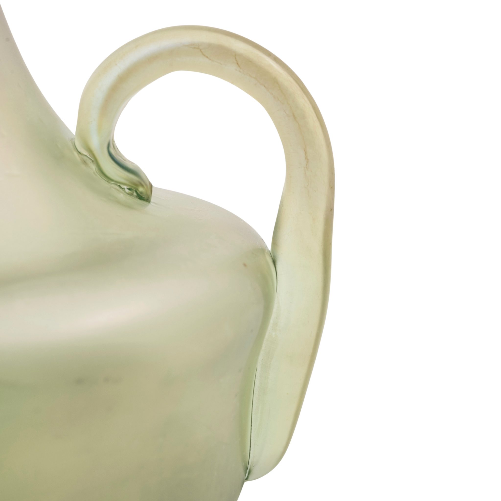Der Formentwurf dieser Vase stammt von Robert Holubetz, einem der begabtesten Schüler Koloman Mosers an der Wiener Kunstgewerbeschule. Die Henkelvase überzeugt durch eine schlichte, zugleich elegante Silhouette. Ihre nach oben verjüngte Form mit seitlichen Applikationen nimmt deutlich Bezug auf Vasenentwürfe Mosers. Charakteristisch sind der schmale Hals mit waagerechtem Tellerrand sowie drei kleine, frei geformte Henkel, die Hals und Korpus verbinden und im heißen Zustand kunstvoll angeschmolzen wurden.