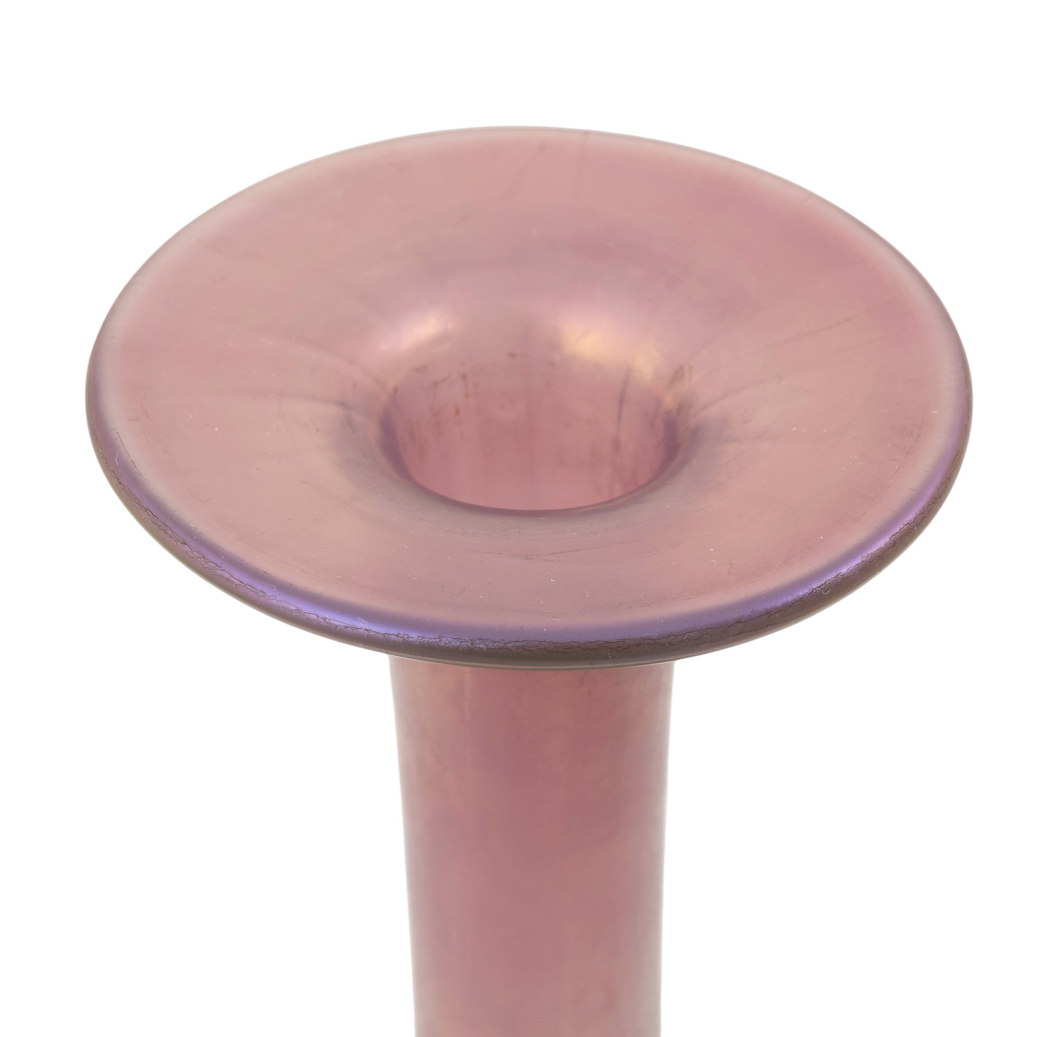 Auch dieses Exemplar ist dieser kreativen Hochphase zuzuordnen. Es trägt den Dekor Syrius, der um 1900 von Antoinette Krasnik – ebenfalls Schülerin Koloman Mosers – exklusiv für Bakalowits & Söhne entworfen wurde. Der Dekor besticht durch einen feinen Farbverlauf von grünlich-transparenten zu rosa-violetten Tönen. Diese moderne Farbgebung wurde bevorzugt auf Glasentwürfen aus dem Umkreis der Moser-Schule eingesetzt, etwa bei Arbeiten von Jutta Sika, Antoinette Krasnik und Robert Holubetz.